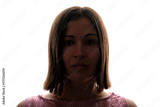 Dark silhouette of a young woman on white background front view.