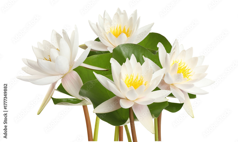 four serene water lilies in full bloom radiating tranquility, with their pristine white petals and lush green leaves, great for spa and nature designs