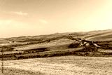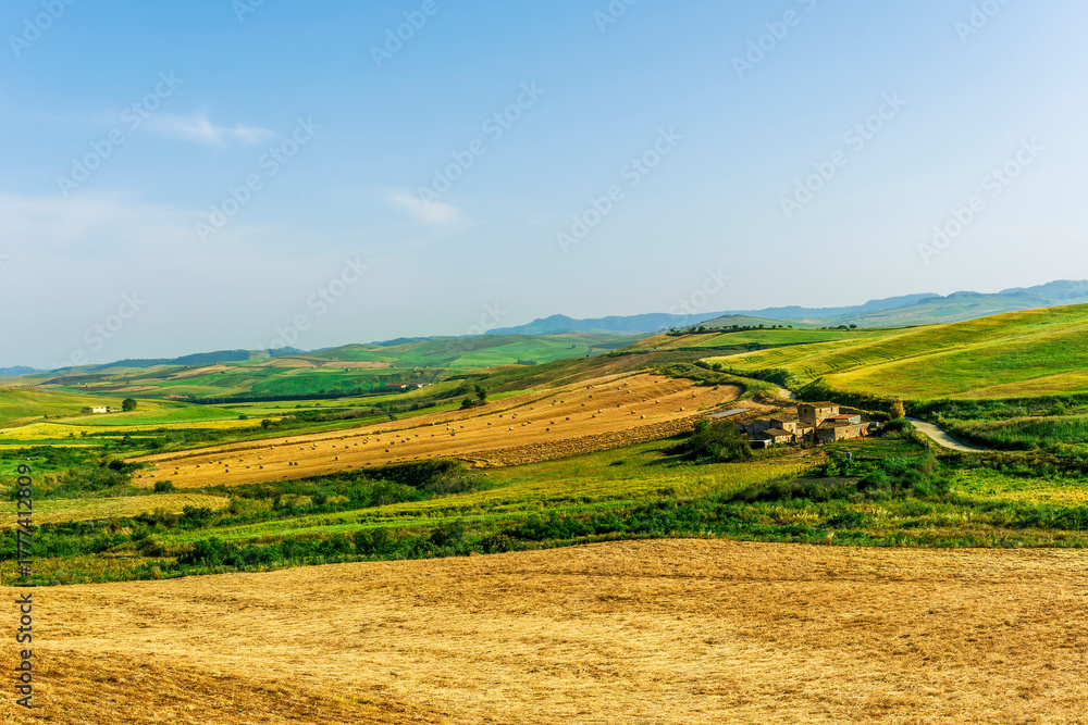 panoramic landscape of a summer season lowland with golden hay hills and green grass on foreground and beautiful sunset sky on background
