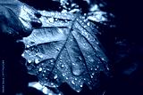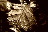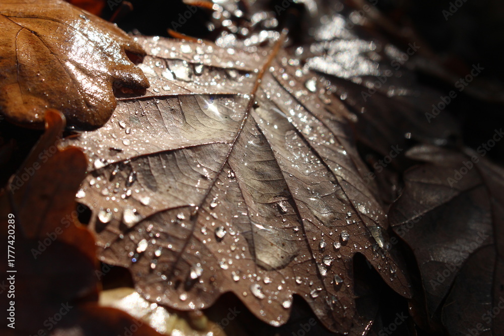 A close up photograph of rain droplets on a decaying oak leaf on a forest floor, with autumn colours in English woodland