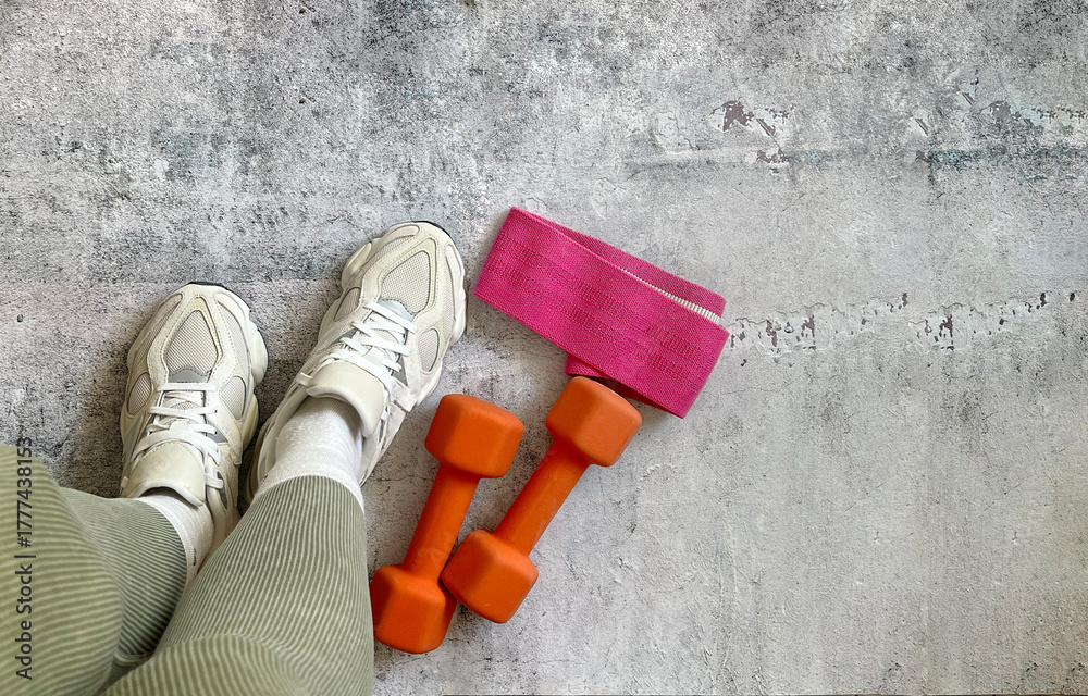 Woman legs with dumbbells and elastic band