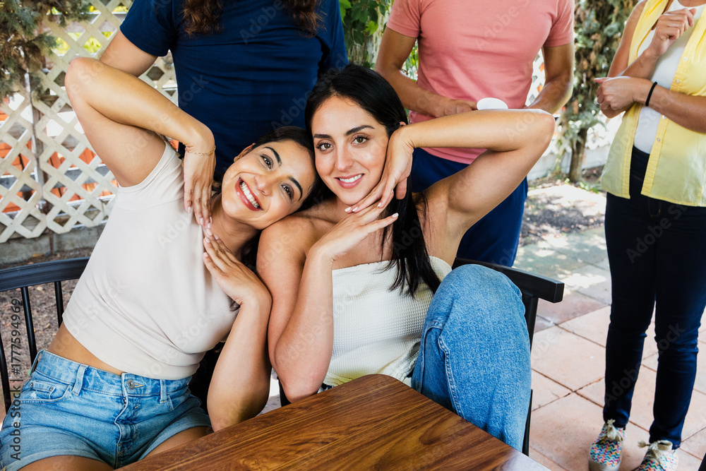 portrait of two young latin american women friends having fun in Mexico, hispanic people in outdoor activities