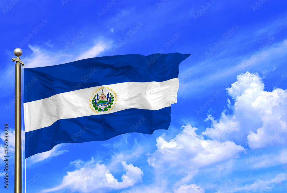Bandera Magna - El Salvador Flag Waving In The Wind On A Beautiful Summer Blue Sky.