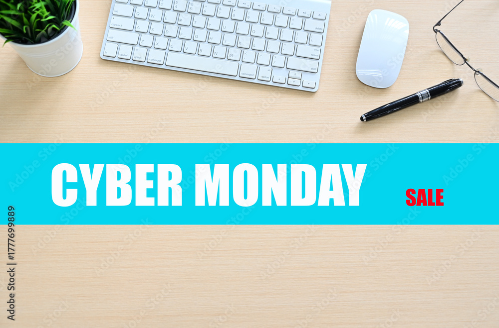 Flat Lay of Workspace with Cyber Monday Sale Message — Digital Marketing and E-commerce Promotion