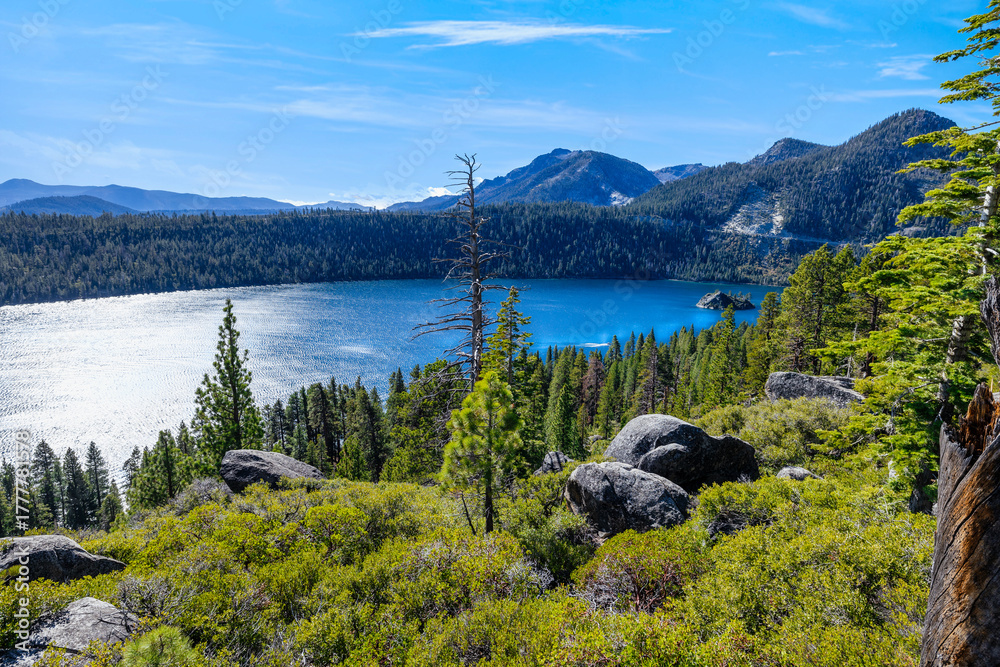 Sunny panoramic view of Emerald Bay and Fannette Island at Lake Tahoe California USA with clear blue water surrounded by pine forest mountains and granite rocks under bright summer sky