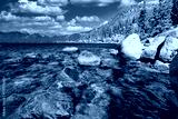 Lake Tahoe California USA view of clear turquoise water with granite rocks and pine forest along mountain shore under blue sky with clouds scenic summer landscape of Sierra Nevada nature