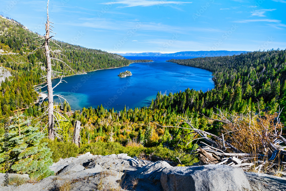 Emerald Bay Lake Tahoe California USA panoramic view of blue lake water surrounded by green pine forest and Sierra Nevada mountains under clear sky popular travel and nature destination