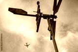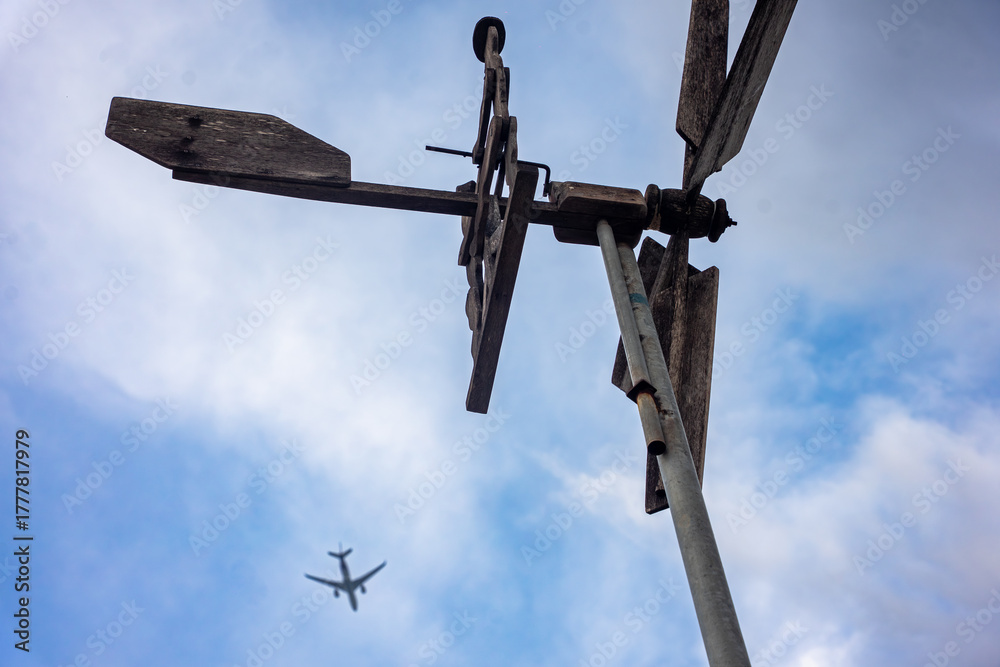 A unique contrast between old, wooden directional weather vane and a modern commercial jet airplane silhouetted against a dramatic cloudy sky. Symbolizes technology, travel, environment, and movement.