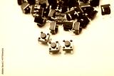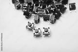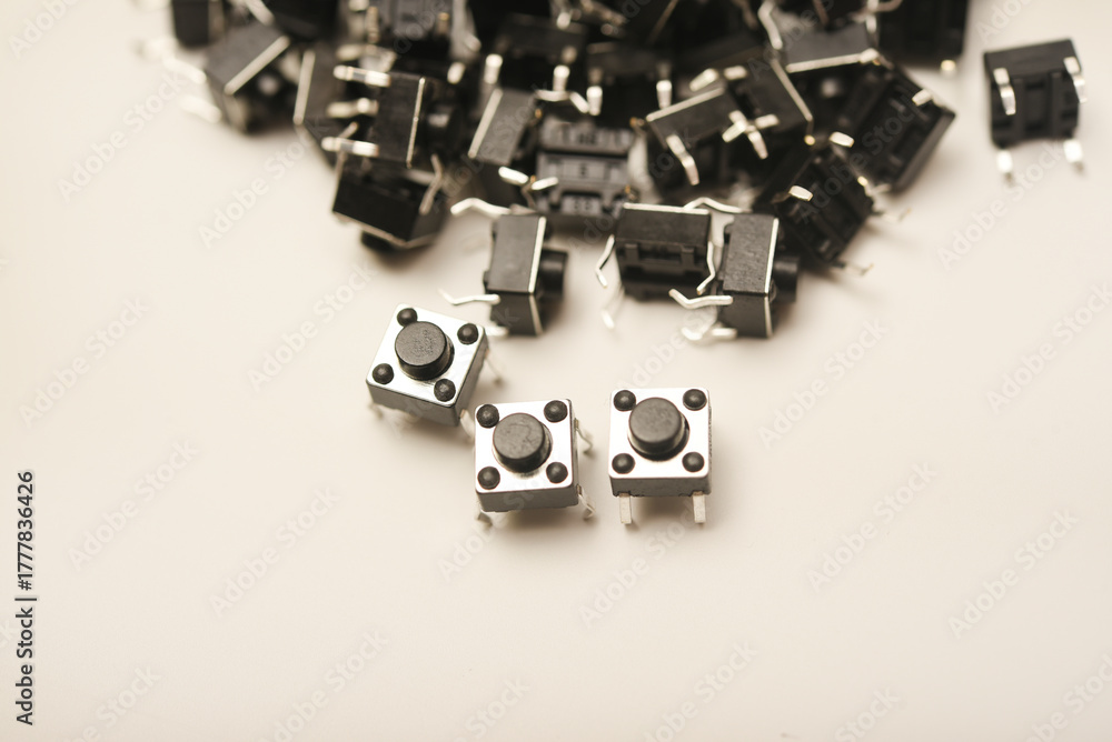 Black electronic buttons on a white background. Electronic elements. Power buttons.