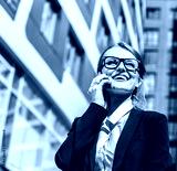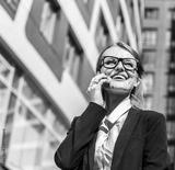 Young blonde caucasian businesswoman wears glasses, white blouse and a black jacket is talking phone before the modern corporation building in the background