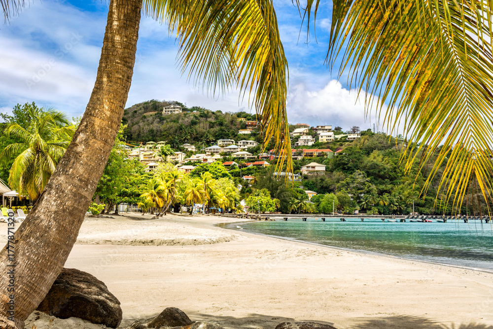 The beach of Anse a l'Ane, Trois Ilets, in Martinique, France, framed by a palm tree on a sunny day.