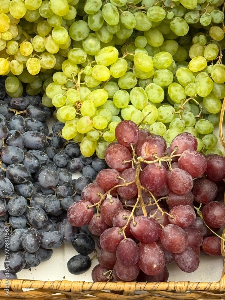 Assorted grapes in basket with red, green, and black varieties, perfect for fruit backgrounds