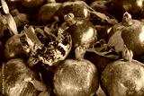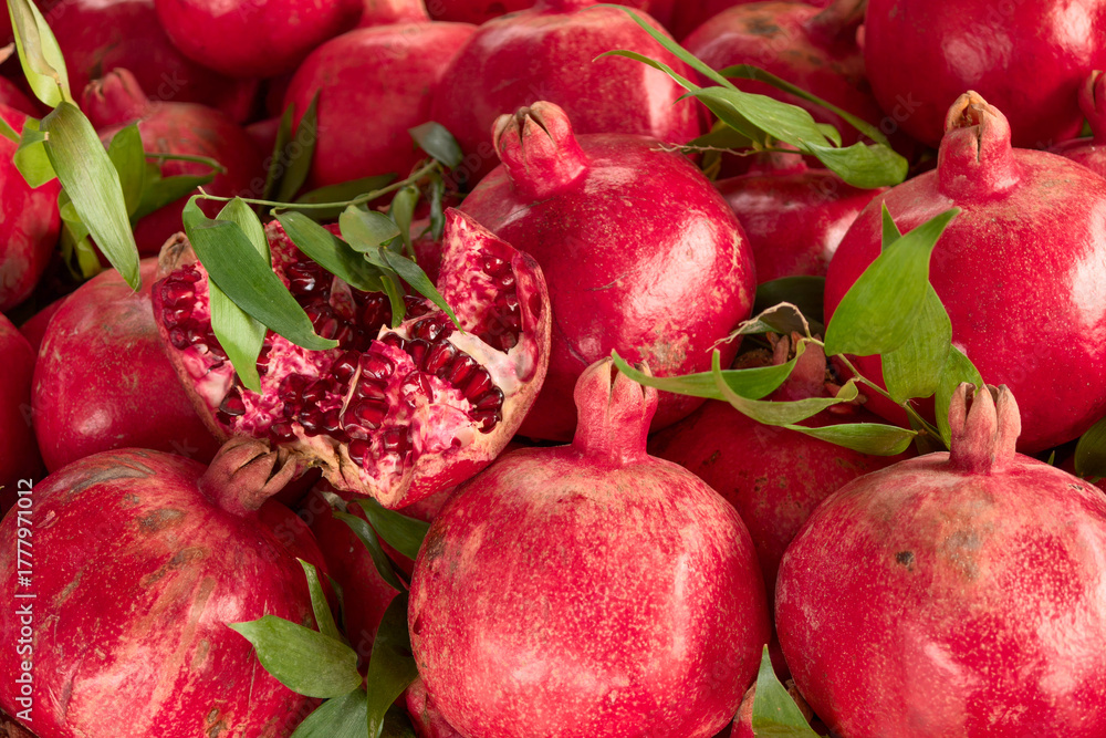 Ripe pomegranates close up, selective focus. Red pomegranate fruits on the market, natural background