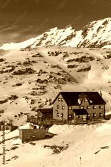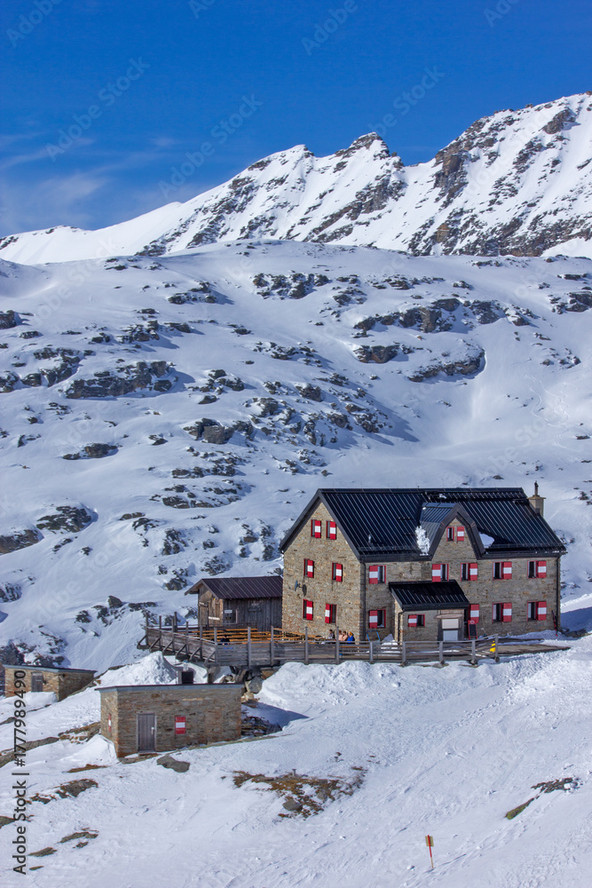 sturdy, traditional alpine lodge built of stone with a dark roof and contrasting red window shutters