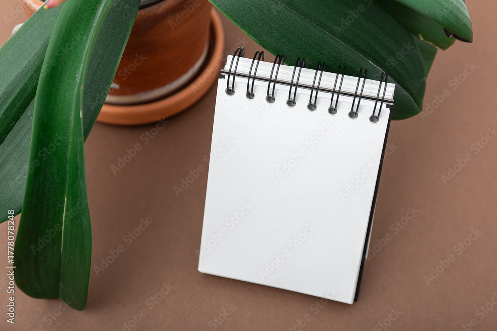 Blank spiral notebook near green leaves and terracotta pot. Concept of balance, mindfulness and natural creativity in everyday planning.