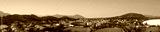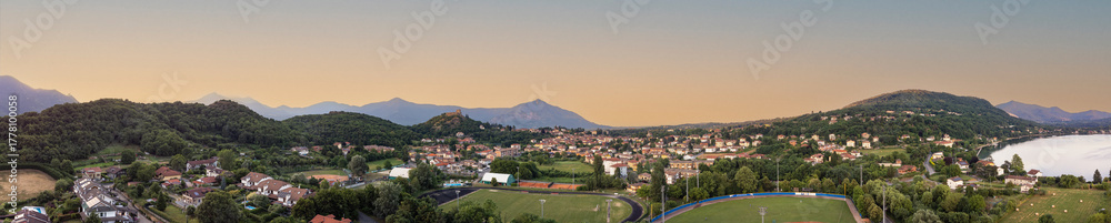 Aerial sunset view of Avigliana, Italy, Piedmont , Turin,Italy A beautiful town with a medieval castle and red-roofed houses, surrounded by the green hills of Susa and trees on a sunny day.