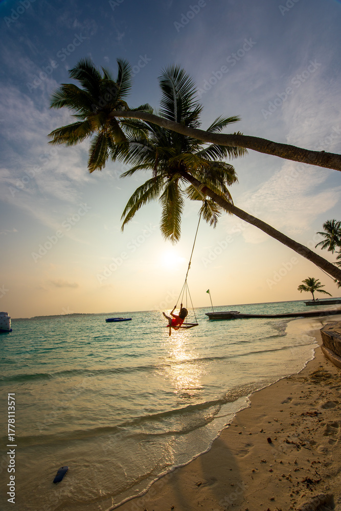 Tranquil closeup calm sea water waves with palm trees. Tourist swinging in sunset time. Tropical island beach landscape exotic shore coast. Summer vacation, holiday amazing nature., Maldives.