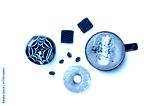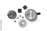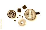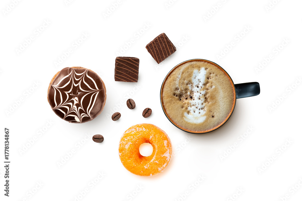 Flat lay of Coffee cup with tasty donuts and layerconcept beverage menu chocolate layer cake cake on white background. Top view