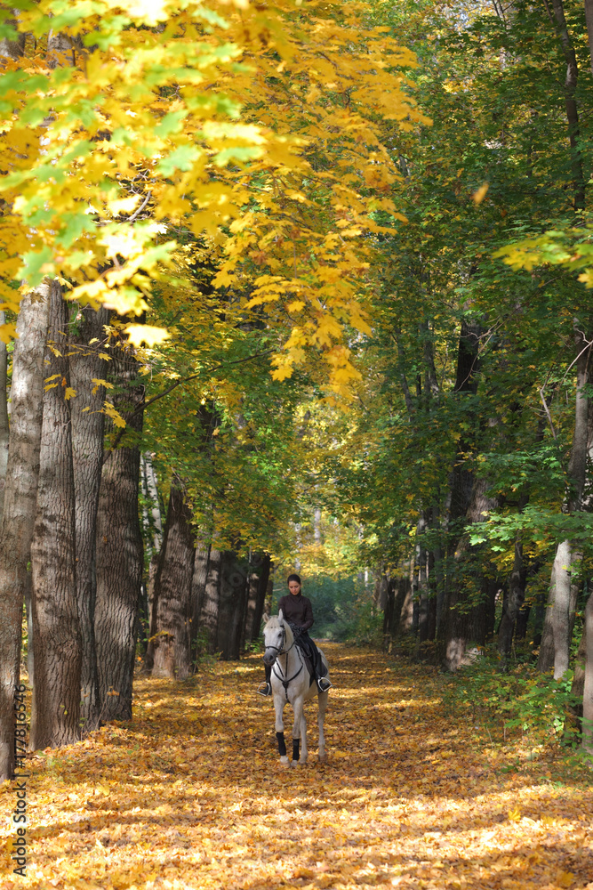 Equestrian girl ride grey arabian horse in autumn woods