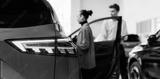 Modern car dealership interior featuring sleek vehicle design, illuminated taillights, and customers engaging in car sales discussions, showcasing a vibrant automotive sales environment
