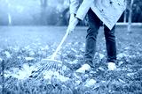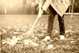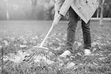 Woman raking fallen leaves on green lawn outdoors, closeup