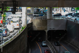 A cityscape of traffic jam at the city street in Tokyo telephoto shot