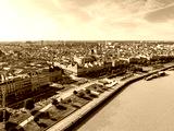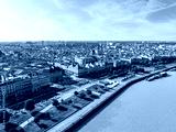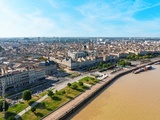 A drone shot showcases the beautiful cityscape of Bordeaux, France, highlighting its historic architecture, the Garonne River, and the lively quayside promenade.