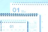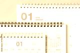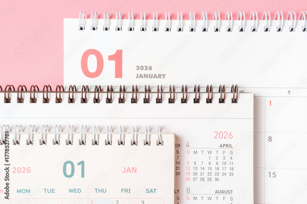Paper calendars for 2026 on pink background close-up, top view.