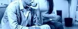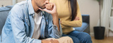 Family problem concept. Tension in relationship between married couple, husband and wife staying sitting separate after quarrel in the living room.