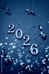2026 Happy New Year golden glittering numbers and confetti stars for festive background top view, flat lay.