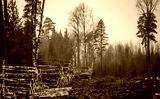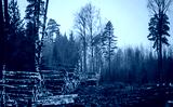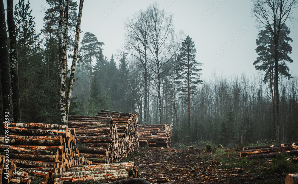 Foggy forest clearing filled with piles of freshly cut timber. The image shows forestry operations and the logging industry’s impact on the natural environment during an overcast autumn day.