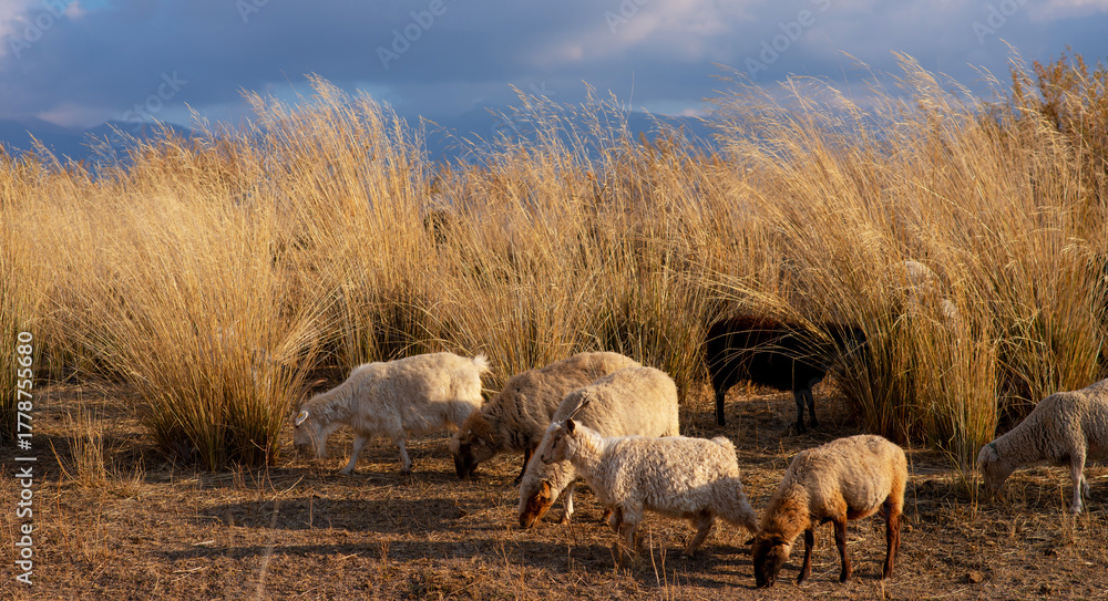 Sheep grazing in a field with tall, golden dry grass under a dramatic sky, illuminated by the warm light of the setting sun, creating a serene pastoral scene in the countryside