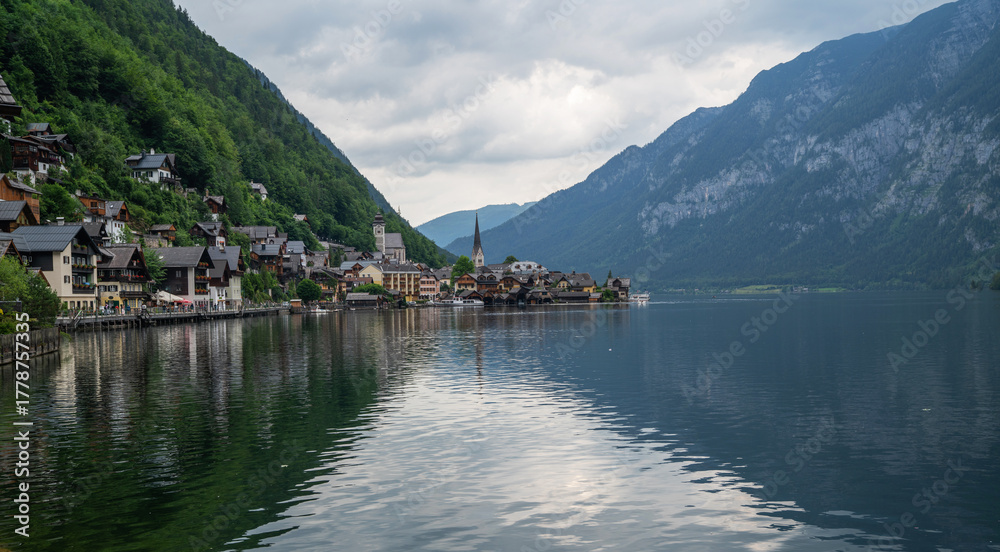 Lakeside village of Hallstatt in the Austrian Alps with traditional alpine houses, mountain slopes covered in dense forest, and church towers reflected in the calm waters of lake under cloudy skies.