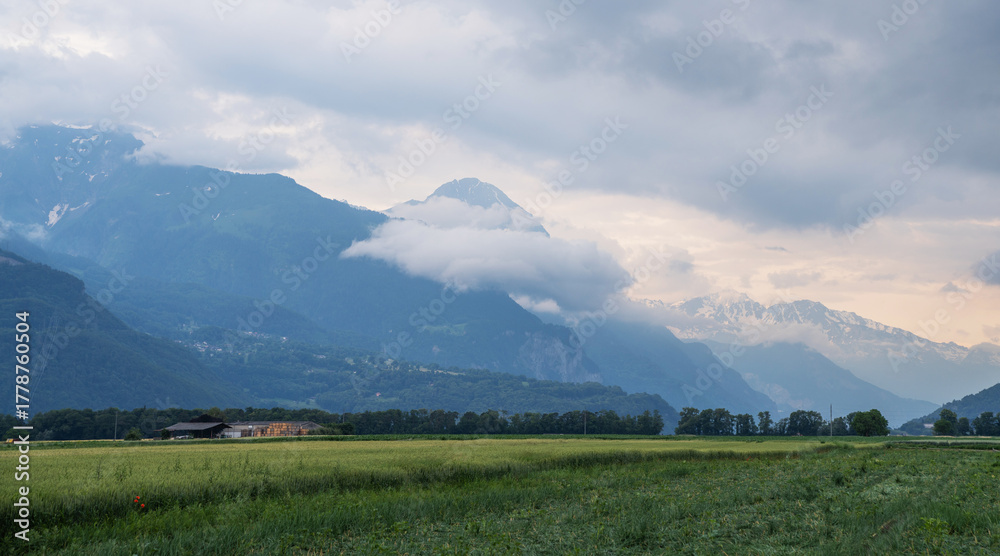 Wheat fields near Saint-Maurice, Switzerland, stretch beneath overcast skies with low clouds brushing the alpine slopes. Snow-covered peaks and distant villages are visible across the valley at sunset