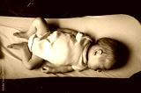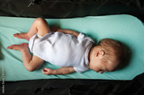 The scene shows a baby peacefully sleeping in a travel crib. Soft green bedding surrounds the child, creating a serene atmosphere perfect for rest while families travel.