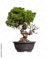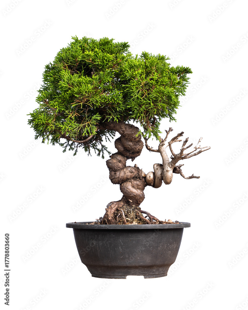 Beautiful bonsai tree in black ceramic pot on white background. Concept of nature, gardening, and zen art.