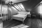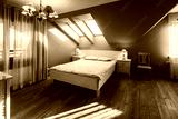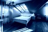 Modern cozy bedroom with skylight windows, wooden floor, and stylish lighting. Comfortable interior design.