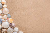 Different beautiful sea shells on light brown sand background. Closeup. Empty place for text. Top down view.