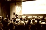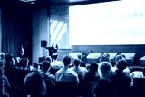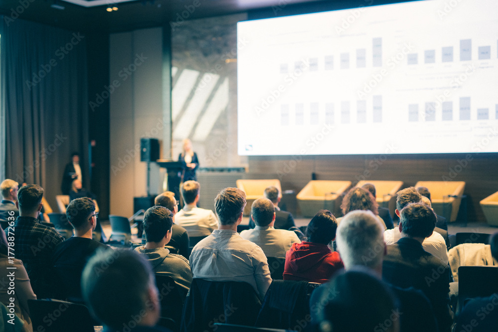 Speaker giving a talk in conference hall at business event. Rear view of unrecognizable people in audience at the conference hall. Business and entrepreneurship concept