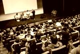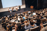 Interview and round table discussion at business convention and presentation. Audience at the conference hall. Business and entrepreneurship symposium.