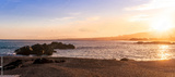 beautiful coast beach with sea gulf water during sunset or sunrise with golden sand, nice black rocks and stones, colorful vawes and clouds in thr sky