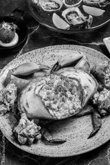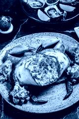 Sapateira Recheada traditional Portuguese stuffed crab meal with mixed seafood side dishes on gourmet restaurant table in Lisbon Portugal