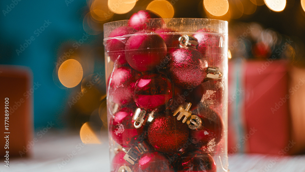 Beginning to prepare Christmas decorations on the table with colorful red balls