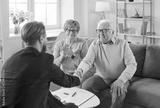 Satisfied senior couple making deal, signing contract or agreement paper, shaking hands with professional agent, financial advisor or medical insurance broker. Trust, services for older people concept