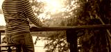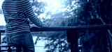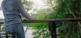 Rear view of a woman reading book at outdoor eco friendly hotel with green space. Selfcare digital detox concept retreat mental health wellness nature connection and peaceful relaxation sanctuary.