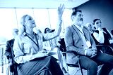 Professional team engaged in an educational seminar participating actively with colleagues in a collaborative learning environment