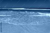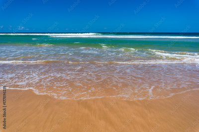 Nature background of waves on sand shore and clear blue sky