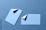 Green paper message notes or sheets with folded edge dog-ear earmark and copy space for text on blue background, top view flat lay conceptual desk backdrop