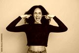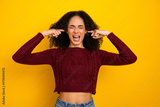Young stylish woman covers ears with fingers against a bright yellow background wearing a burgundy sweater posing for a fashion lifestyle stock photo