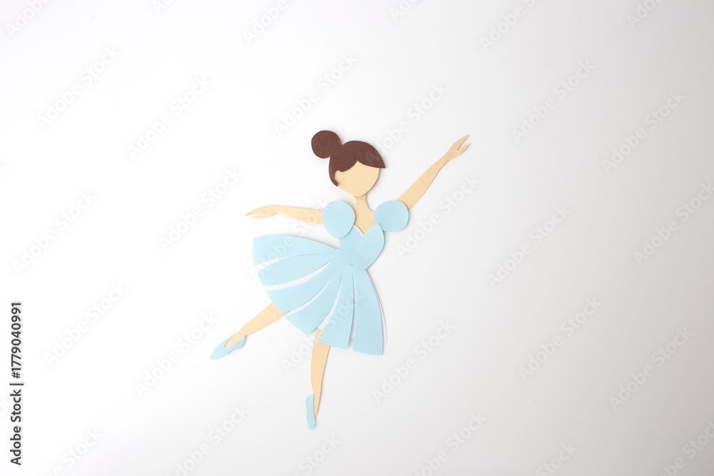 Paper ballerina cutout in elegant pose with blue dress, ideal for dance school branding, children's book illustration, craft blog visuals, or handmade product promotion